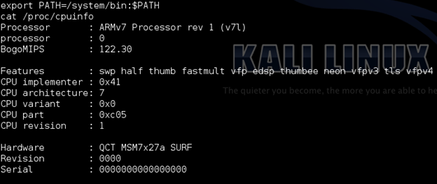 - I have set my path to system/bin and am now executing the command "cat /proc/cpuinfo" to see the CPU information on the device.