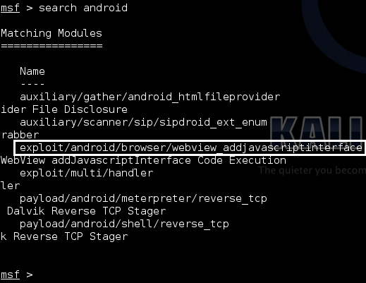 - Type "search android" to see all the exploits associated with Android. You should see the screen below (make sure you have updated your Metasploit to see the screen).
