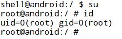 - Let us first reconfirm manually if the device is rooted by executing "su" and "id" commands.