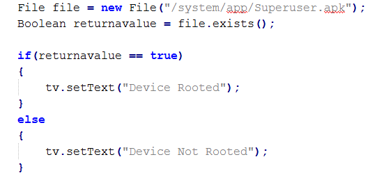 For example, if a developer uses the following code snippet to check for root, the procedure to bypass the detection is different: