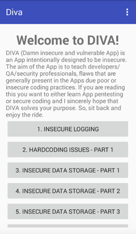 DIVA is a vulnerable Android application. According to their official website, "DIVA (Damn insecure and vulnerable App) is an App intentionally designed to be insecure. The aim of the App is to teach developers/QA/security professionals, flaws that are generally present in the Apps due poor or insecure coding practices."