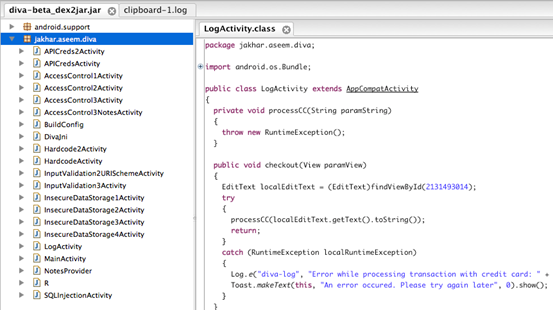 Open up LogActivity.class file using JD-GUI and check the following piece of code.