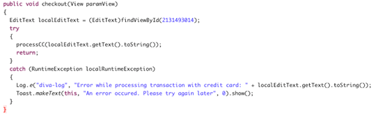 E/diva-log( 1695): Error while processing transaction with credit card: 0000000000