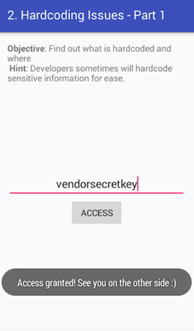 Click on "2. HARDCODING ISSUES - PART 1" in your application. The goal is to find out the vendor key and enter it into the application to gain access.