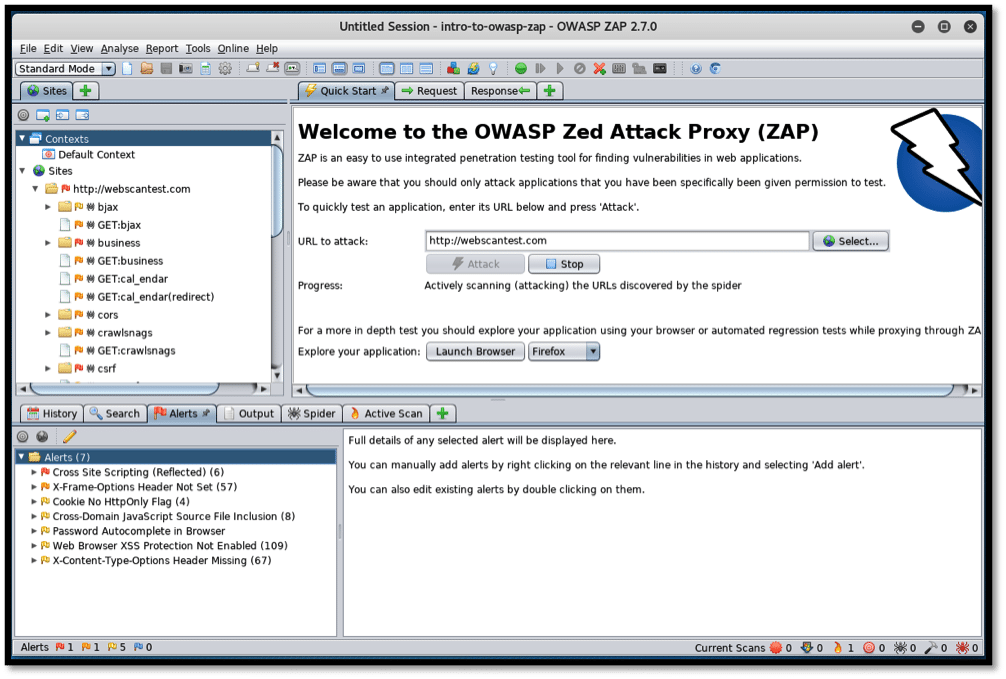 On clicking on “attack” above, ZAP progresses to scan the target website for vulnerabilities, and reports them. Alternatively, we can set up an intercept on our browser by clicking on the “Launch Browser” button under the “Attack” button. This ensures that all the websites visited by the browser are scanned for vulnerabilities every time they are visited.