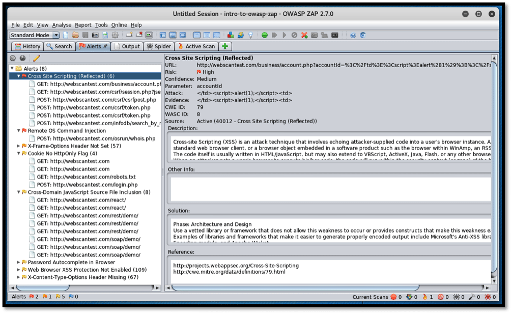 ZAP proceeds to scan the target website for any vulnerabilities, and discovered issues are sent to the “Alerts” tab at the bottom window. Alerts are identified as per the OWASP top 10 listing of the most prevalent web application vulnerabilities.