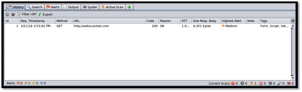 The “History” tab displays the websites being tested. In this case we are testing only a single target, so the history record will show a single entry.