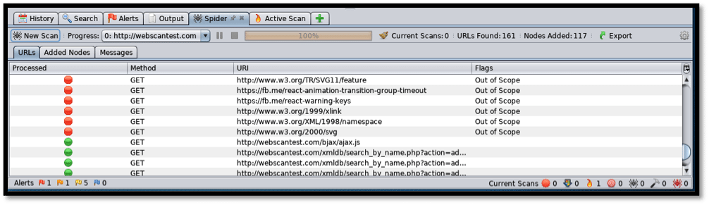 The “Spider” tab shows the files crawled (discovered) within the web application. Spidering can be likened to Fuzzing, where the directories and files resident on the website are discovered and logged for later active vulnerability scanning.
