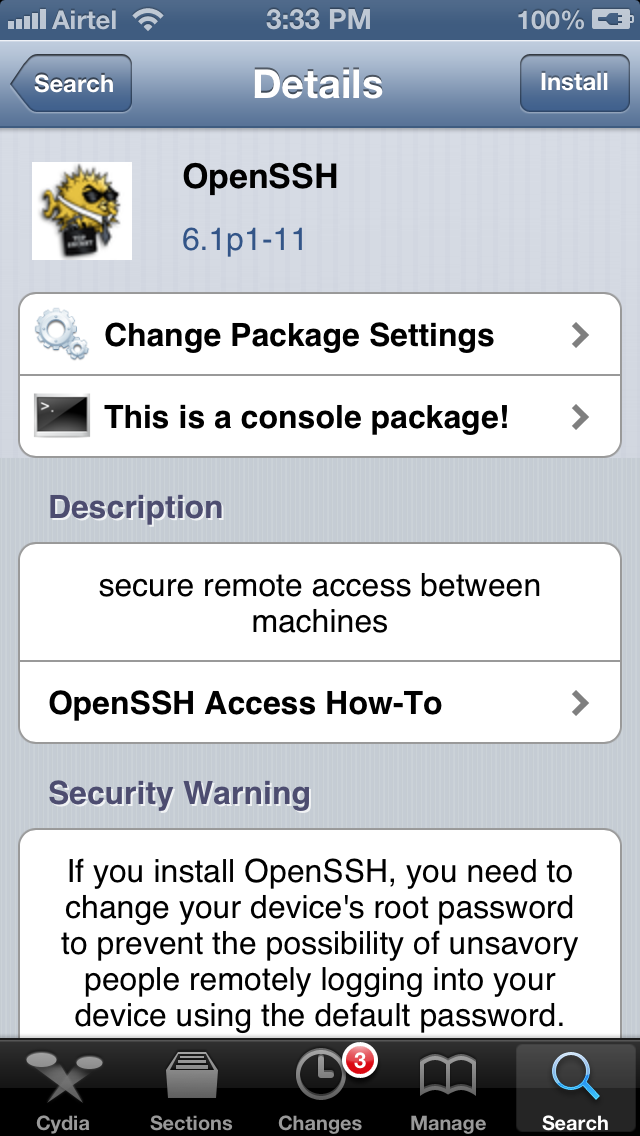 Before we use ssh to log in to the device, we should install some other command line tools also. Almost all the popular hacker tools can be installed by using the BigBoss Recommended tools package which comes with a list of hacker tools. To install BigBoss Recommended tools just search for it in Cydia and tap on install.