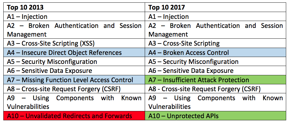 Before we go into the detail of what has changed in OWASP Top 10 vulnerabilities of 2017, let us take a glance at the table below for a quick review.