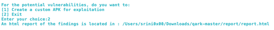 INFO - Support for other component types and dynamically adding extras is in the works, please check for updatesAfter finishing the scan, QARK will present the following screen. This is one of its unique features, which allows us to create a POC app by choosing option [1].