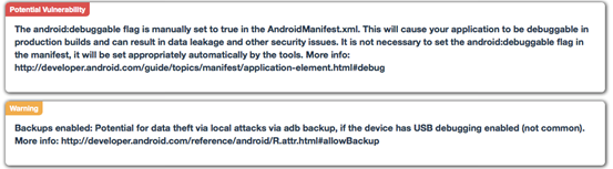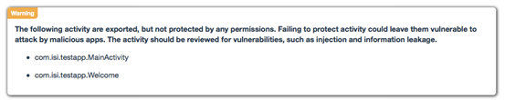 As we can see in the figure above, QARK has identified several issues among which one is a potential vulnerability due to the fact that "android:debuggable" value is set to true. QARK also has provided a warning that the activities shown above are exported.
