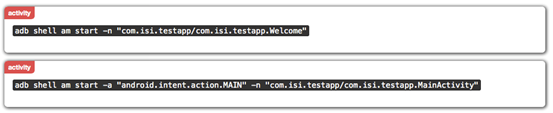 INFO - Until we perfect this, for manually testing, run the following command to see all the options and their meanings: adb shell am. Make sure to update qark frequently to get all the enhancements! You'll also find some good examples here: http://xgouchet.fr/android/index.php?article42/launch-intents-using-adb