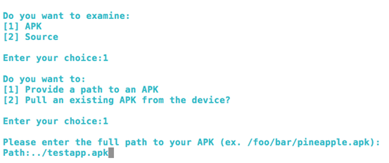 $ python qark.py --source 1 --pathtoapk ../testapp.apk --exploit 1 --install 1