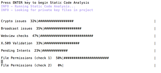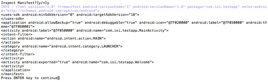 It first displays the manifest file and waits for the user to continue. Press "Enter" to start analyzing the manifest file as shown below.