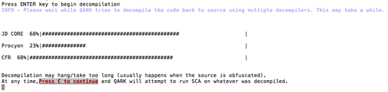 For some reason, if this decompilation process takes longer time we can press "C" to continue with the analysis of whatever the code that was extracted during the decompilation process. QARK uses various tools to do the decompilation process.