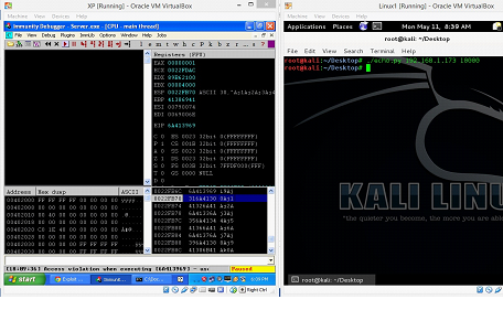 As can be seen in the above screenshot that the program is again crashed, but when we closely look into the debugger (Machine A) we can see the following information.