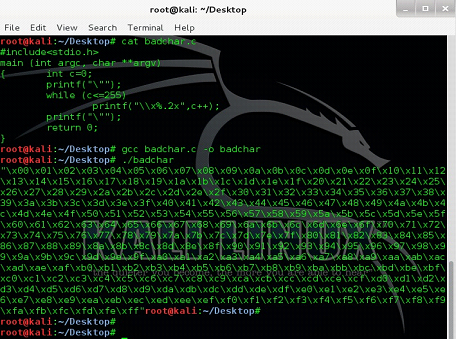 We can see the source code of badchar.c in the above screenshot, after that we have compiled it by the gcc compiler and finally when we run the output file it generates and prints the list of bad characters.