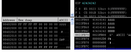 As can be seen in the above screen shot, after running the changed Python script EIP is overwritten with 42424242 and the rest of the stack is holding the value 43434343 in which 42 represents B's in hexadecimal and 43 represents C's in hexadecimal.