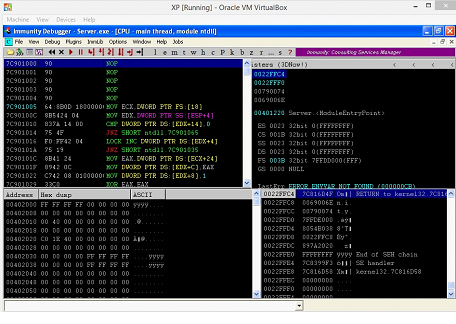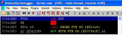 As can be seen in the above screenshot that the server did not crash this time it actually paused where we had created the breakpoint and we can also see our A's, JMP ESP address and C's in the stack. Everything is looking perfect right now. Now, hit the F7 key which is Step Into.