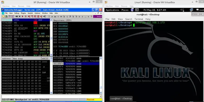 The program has again paused in the debugger as we have created the break point to the JMP instruction and we can see that EIP and ESP is overwritten with the values which we have given in the Python script. If we closely look into the debugger, we can see everything we have appended in the Python script has successfully reached into the stack as we can see JMP Instruction Address, NOP Sled and the shell code.