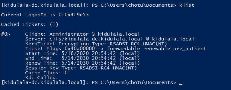 - Now, since we have the NTLM hash of the DC’s machine account, we can create a forged TGS. Below, we have created a forged TGS for CIFS service on DC.