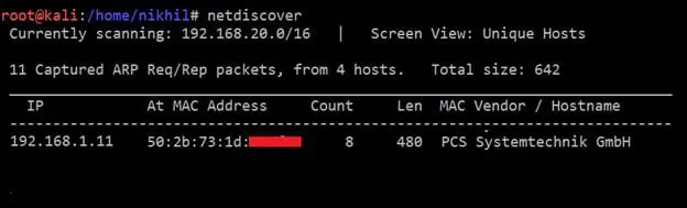 After downloading and running this machine on Virtual Box, we started by running the Netdiscover command to obtain the IP Address of the target machine on the network. The command and its output can be seen in the screenshot given below: