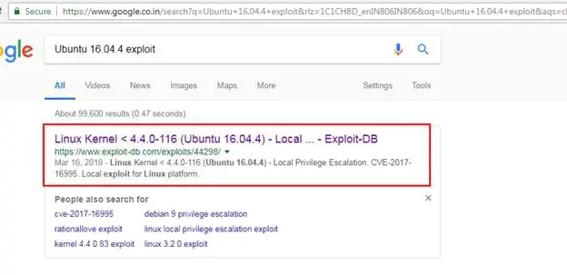 As can be seen in the above screenshot, the target machine is using Ubuntu 16.04.4 LTS. So let's check the exploits for this version of Ubuntu on Google.