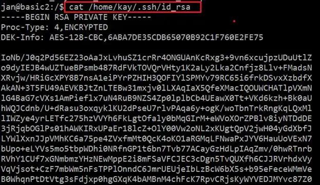 After spending some time running different commands on the target system, I discovered that there was another user in the target system whose SSH private keys could be accessed by this user. Now we had the SSH private keys for the user "kay" on the target machine. It can be seen in the following screenshot.