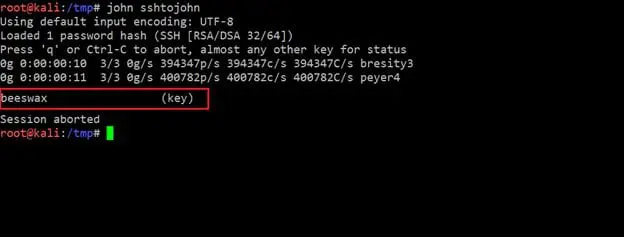 Let's launch the brute force attack to crack the passphrase. We will be using John to crack the password. It can be seen in the following screenshot.