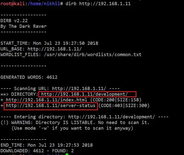 As can be seen in the above screenshot, two directories were identified by the dirb tool on the target machine. Let's open the "development" directory first to see its contents.