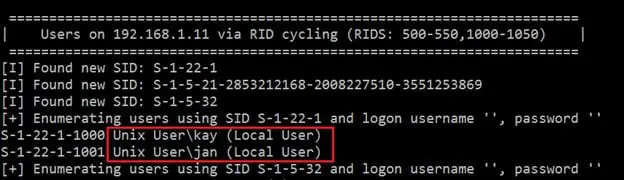 After completion of the scan, a large output was generated by the tool. After analyzing the output I found that two usernames were enumerated by the tool, which can be seen in the following screenshot.