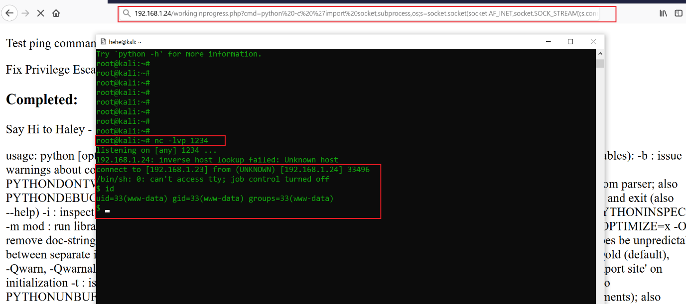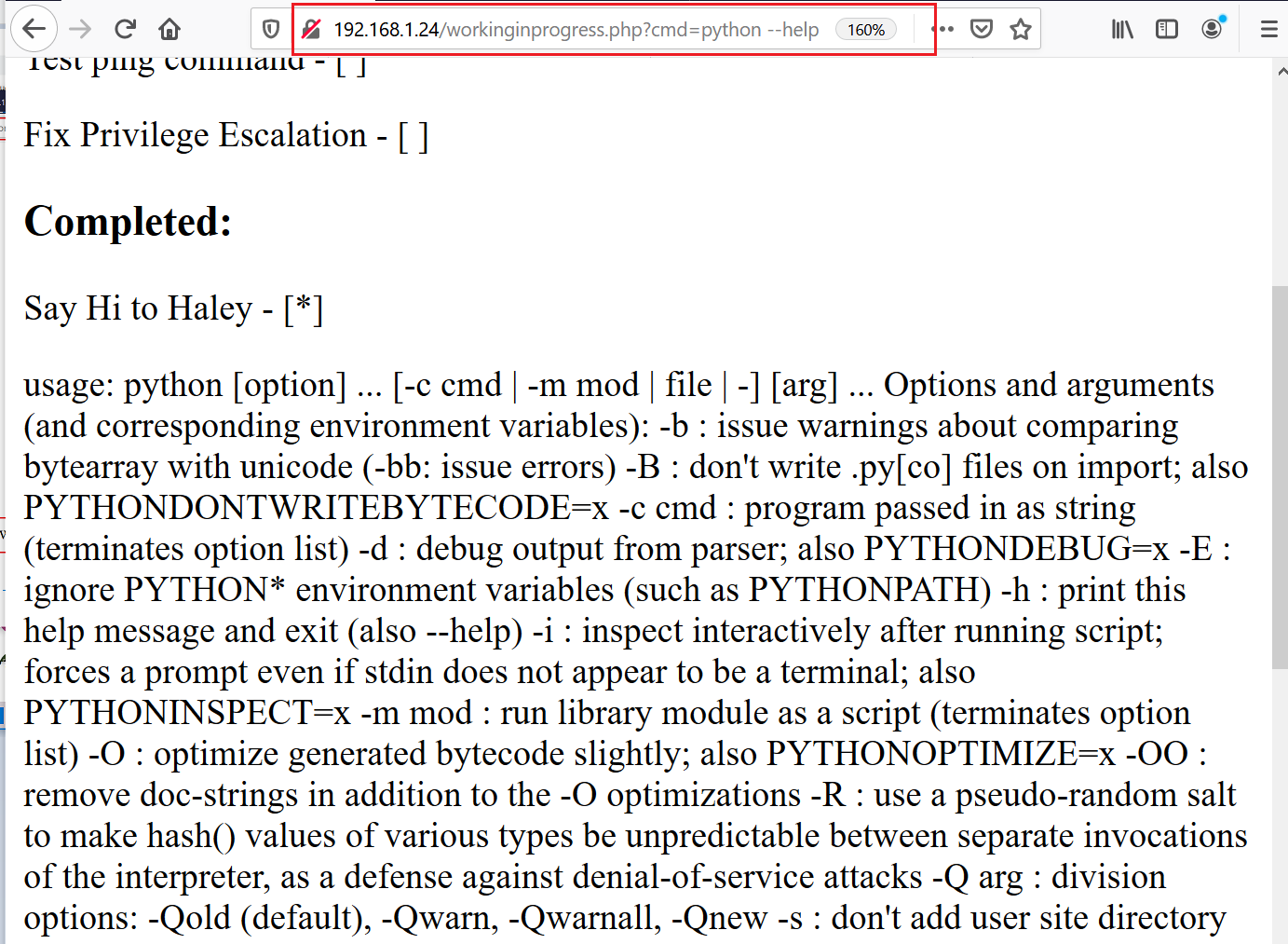 To utilize this vulnerability to gain access to the target machine, I first checked whether “python” is available on the target system. I used the python –help command for this purpose.