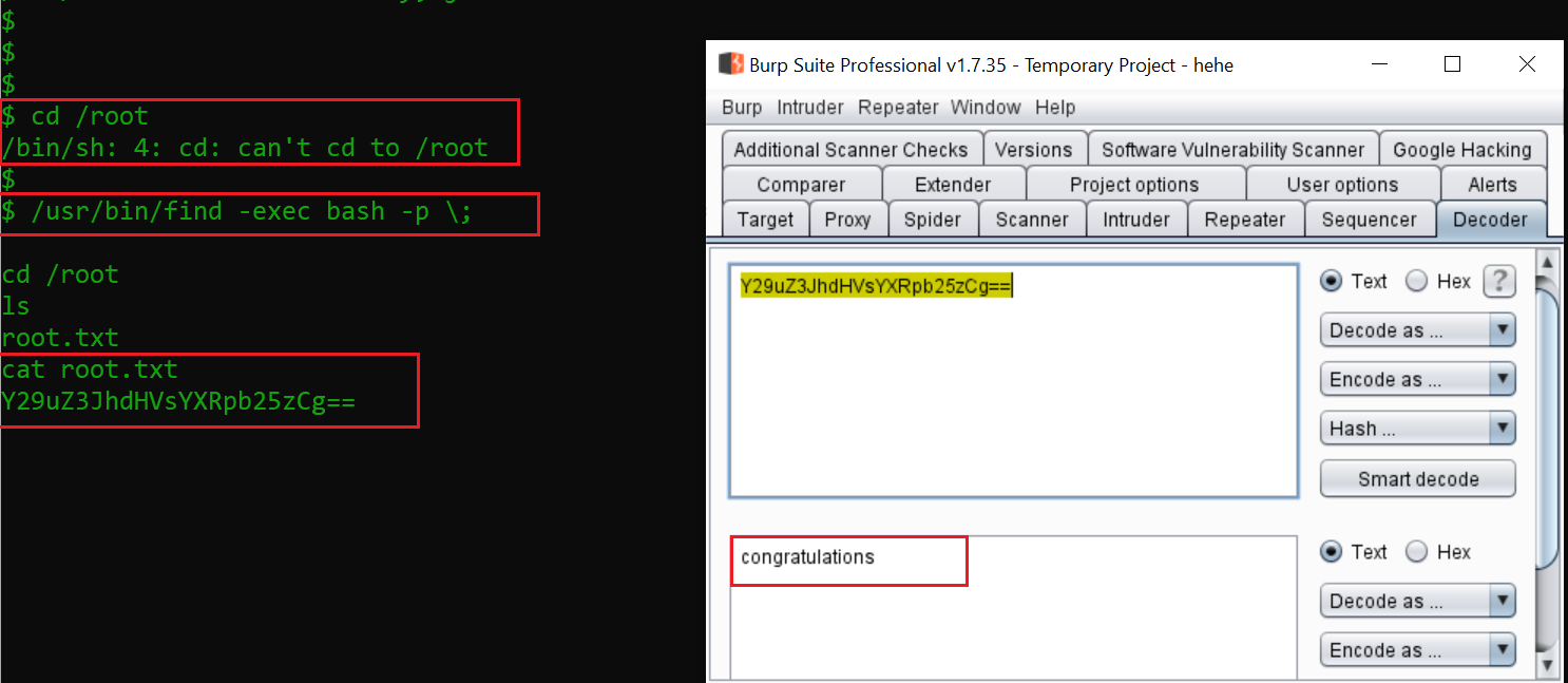 We have now gained access to the root of the target machine. After that, it was not difficult to find the flag file which was in the root directory of the target machine. The flag file was again encoded into Base64. So, I used the Burp decoder to decode it into plain text. The final flag file was “congratulations.”