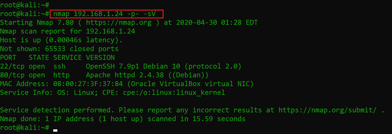 We can see that port 80 and port 22 are open on the target machine. These ports are being used for the HTTP and SSH services, respectively. The above scan also provides some further information about the target system configuration that may be useful for us in later stages.