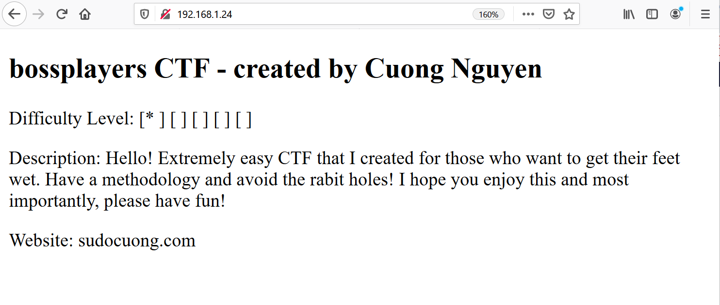 As per the information given on VulnHub, this is a recent CTF which was posted by the author Coung Nguyen. As mentioned by the author, the challenge is aimed at beginners. The aim of the CTF is to get the root. Prerequisites include having some knowledge of Linux commands and ability to run some basic penetration testing tools.
