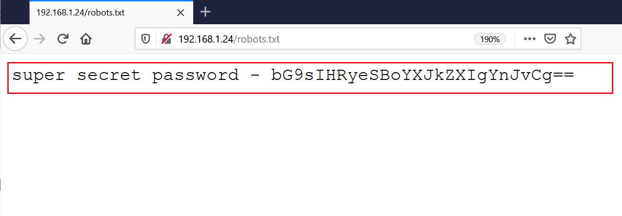 From the robots.txt file, we got a password string. But when we observe closely, the password string is Base64-encoded. The password string is written thus: