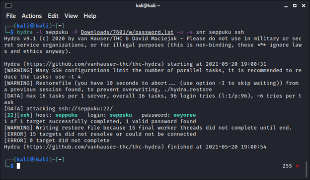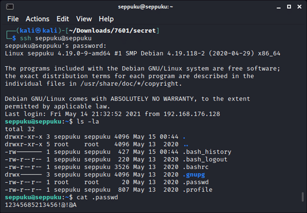 The “hostname” file contains the entry “seppuku,” and if we think creatively, we can try using that as a username in an SSH brute-forcing attack (along with the password list found above).