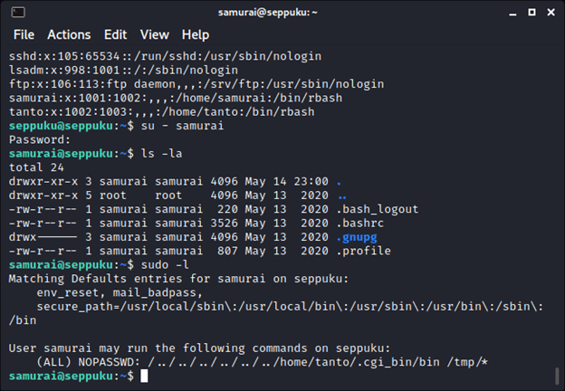 In our home directory, we find a “.passwd” file containing a hopefully valid password to an unknown account. If we list the users on this box by examining the “/etc/passwd” file, we can pare down our targets to “root,” “samurai” and “tanto.” From there, we can try logging in as these users with this new password.