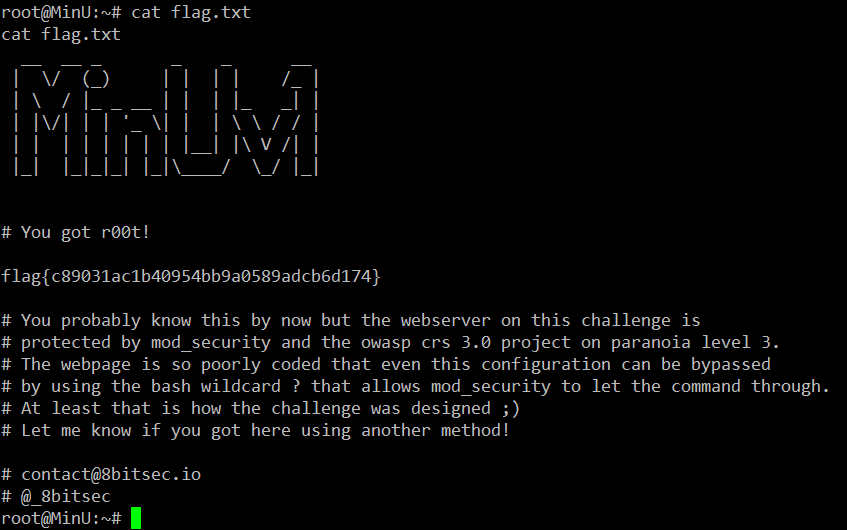 The target of the CTF was to read the flag file after getting the root access. I quickly searched the flag file, which was in the root directory. In the above screenshot, we can see that we have successfully read the flag.