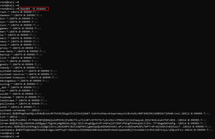 As we have used the base64 encryption to encrypt the /etc/shadow file, let’s open the file. The file contents can be seen in the following screenshot: