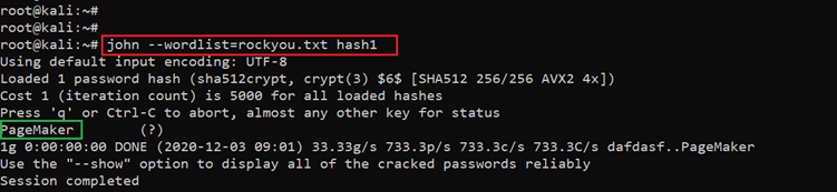 Command used: << john –wordlist=rockyou.txt hash2 >>