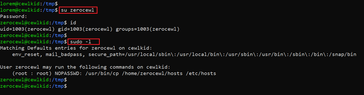 Next, I ran the ‘sudo –l’ command to find out the commands that the current shell can process on the target machine. There was an interesting finding: we were able to view the files in the ‘ipsum’ group by using the ‘usr/bin/cat’ command. This is highlighted in the screenshot above.