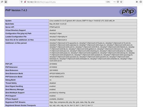 The available files and folders can be seen listed. There is an option to upload files into the target machine web application. We can use this functionality to upload a reverse proxy shell to gain access to the target machine. To help us further in this task, there was already the PHP info file in the target machine application. Open the file to see the running version information and choose the right reverse proxy command. The info.php file can be seen in the following screenshot: