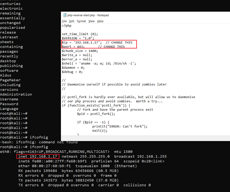 The application is running on PHP 7.4.3. Now we can use PHP reverse shell, which is available by default via Kali Linux on the attacker machine. Before uploading this shell into the target machine, we need to configure the attacker IP address to get the reverse connection. The following screenshot displays the IP address changes made to the code:
